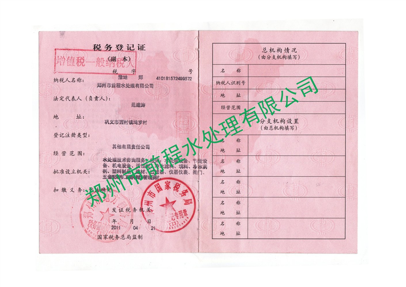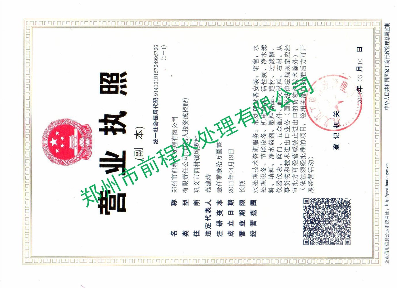 單位全稱:鄭州市前程水處理有限公司